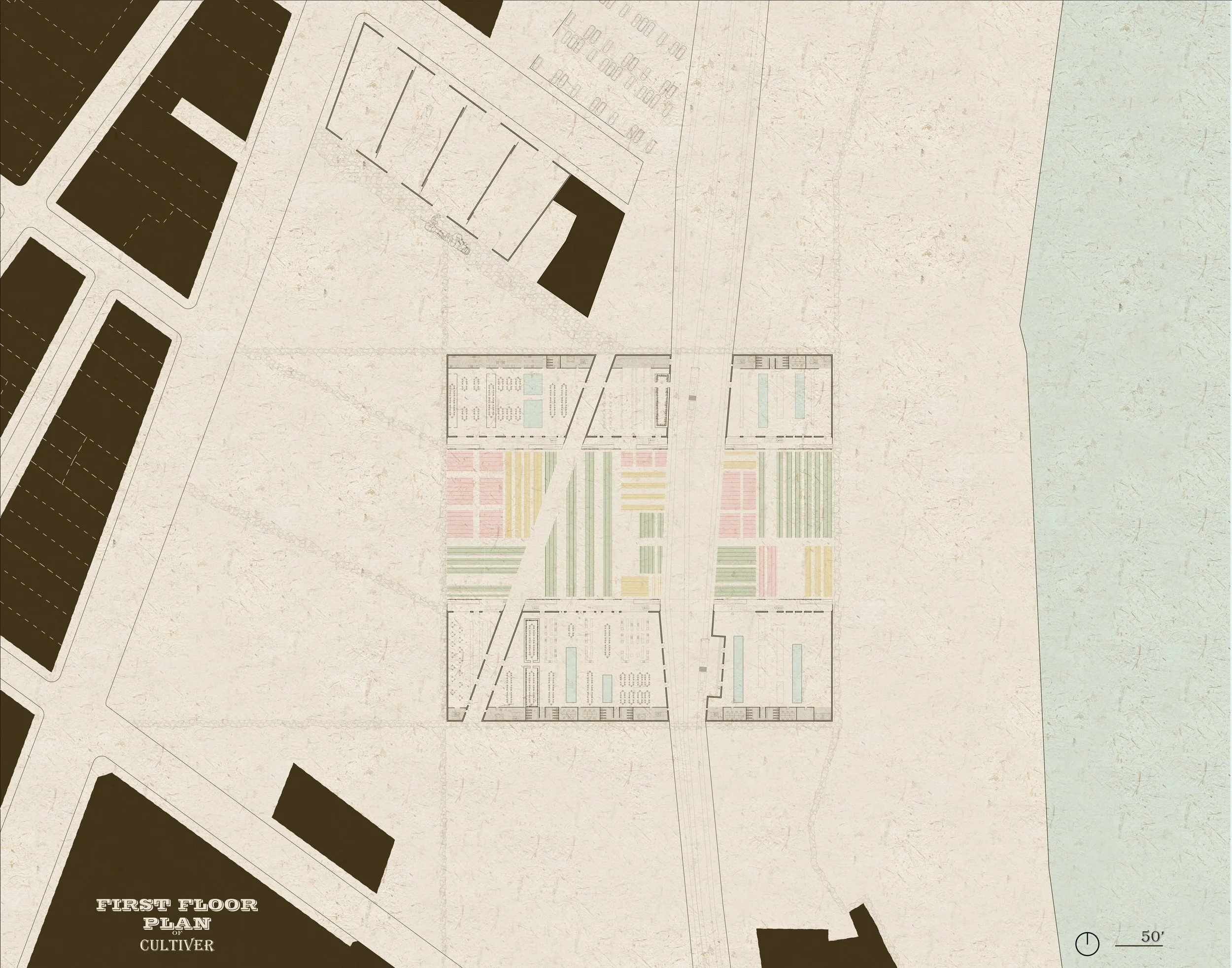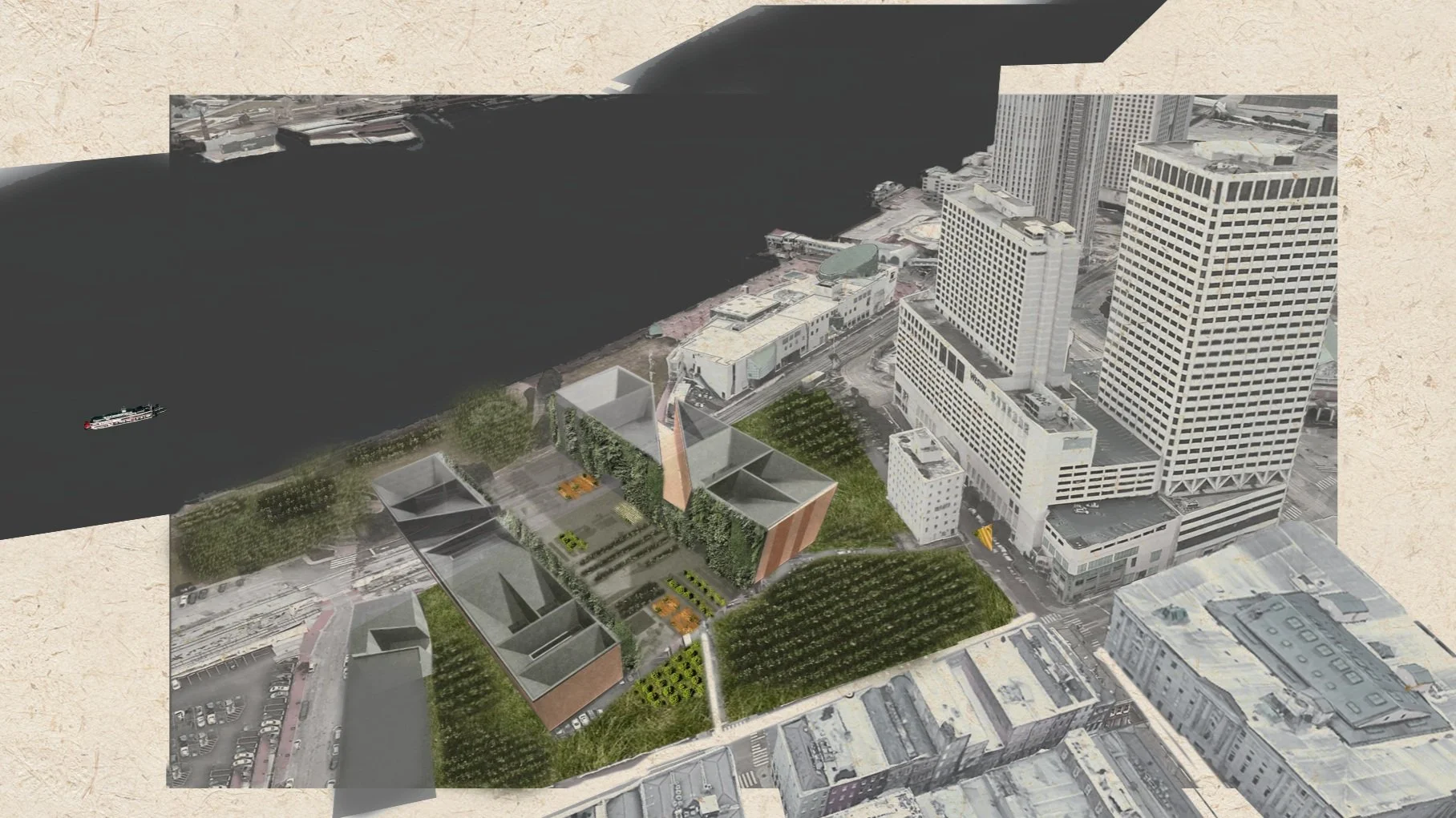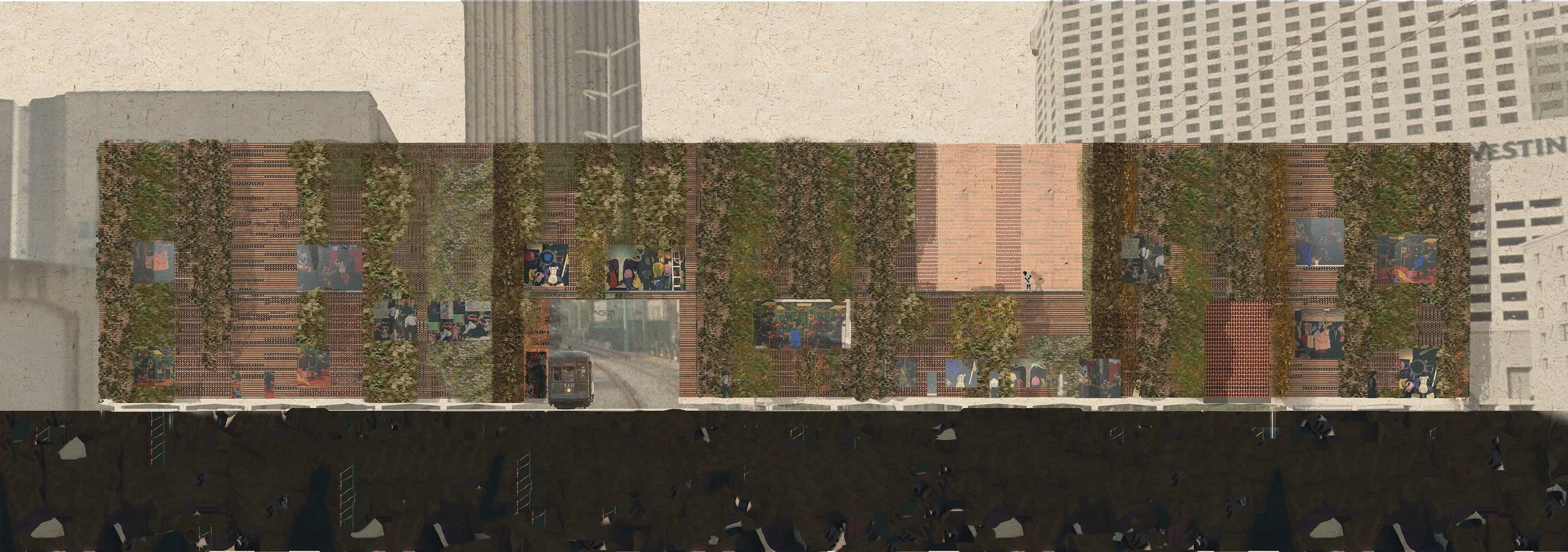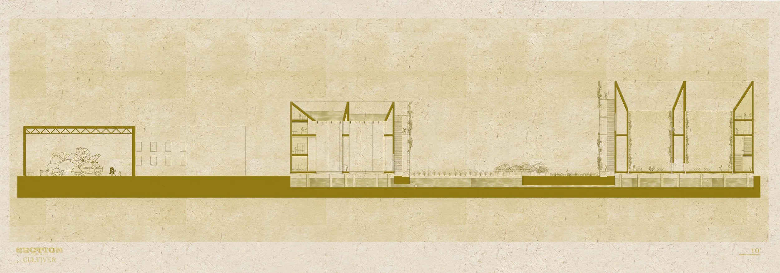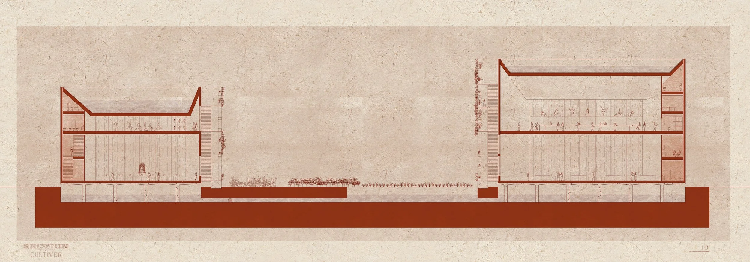 Our cultural center is strategically located to harmonize with the city grid and the natural flow of the Mississippi River. The design features two grand culinary theatres that collect water for a vast farm. The roofs efficiently channel water into an underground cistern, which then nourishes the abundant vegetation. Local fruits and vegetables thrive on the ground, vertical shelving, and hydroponic gardens. Within these theatres, food and local dishes are lovingly prepared, creating an unparalleled dining and performative experience.