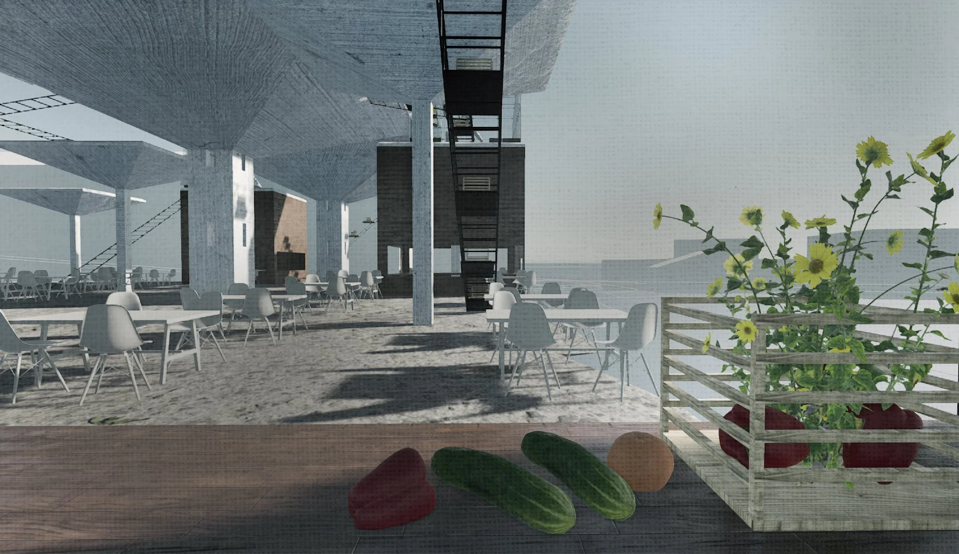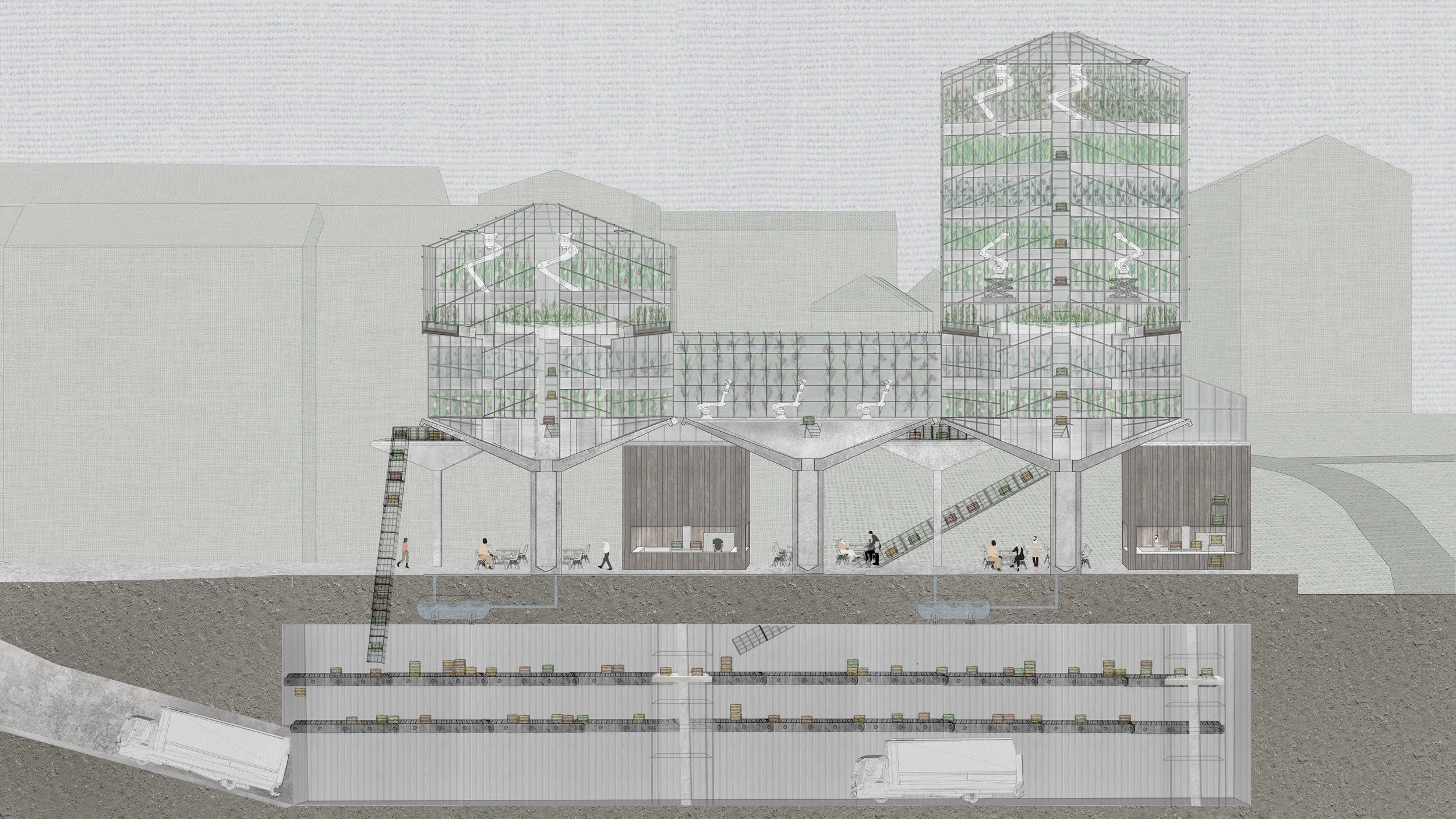 the top level dedicated to food production, the underground level for distribution, and the middle level for observation and exploration. Inspired by the natural structure of food production, the design resembles a tree-like formation.
