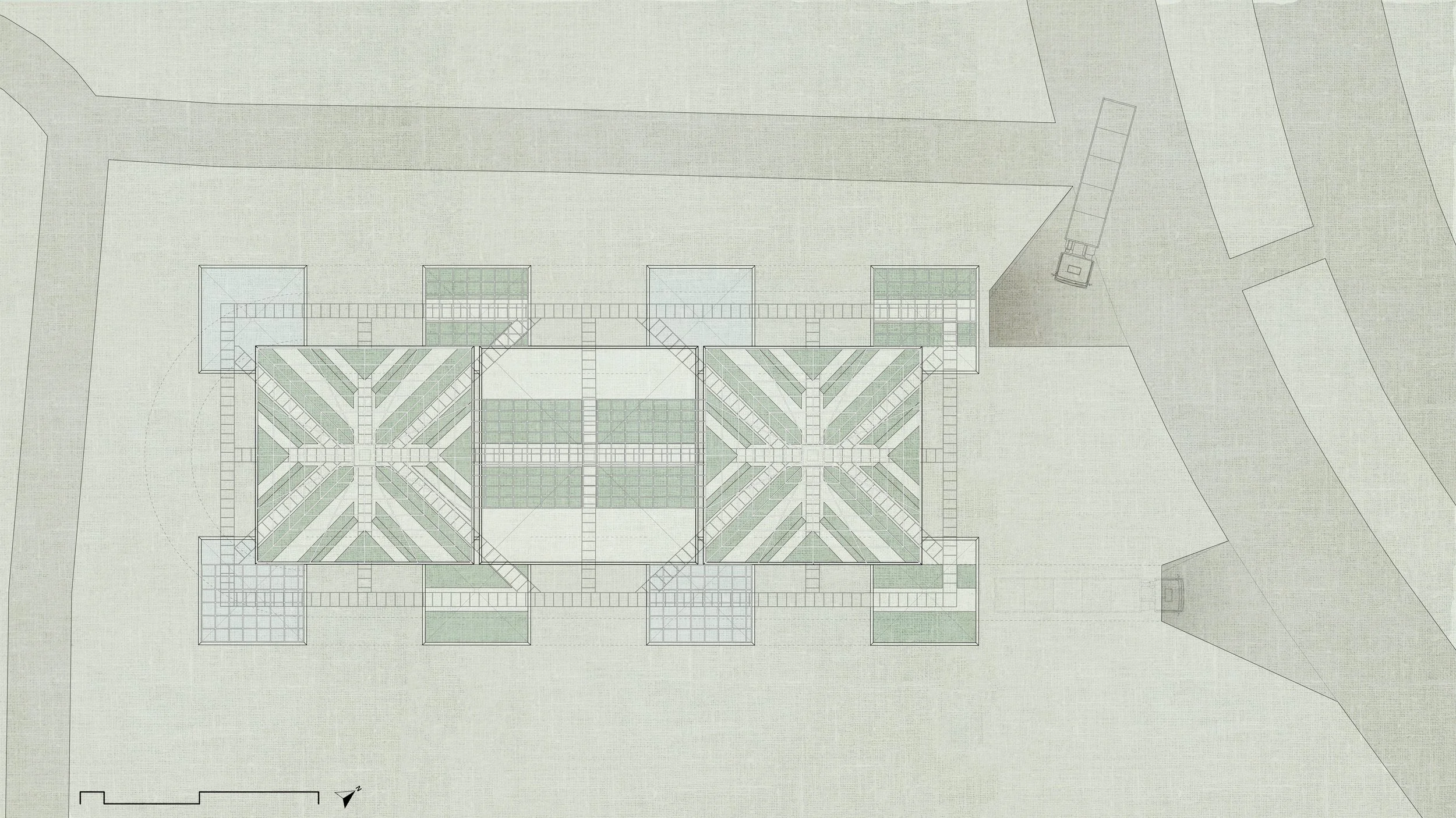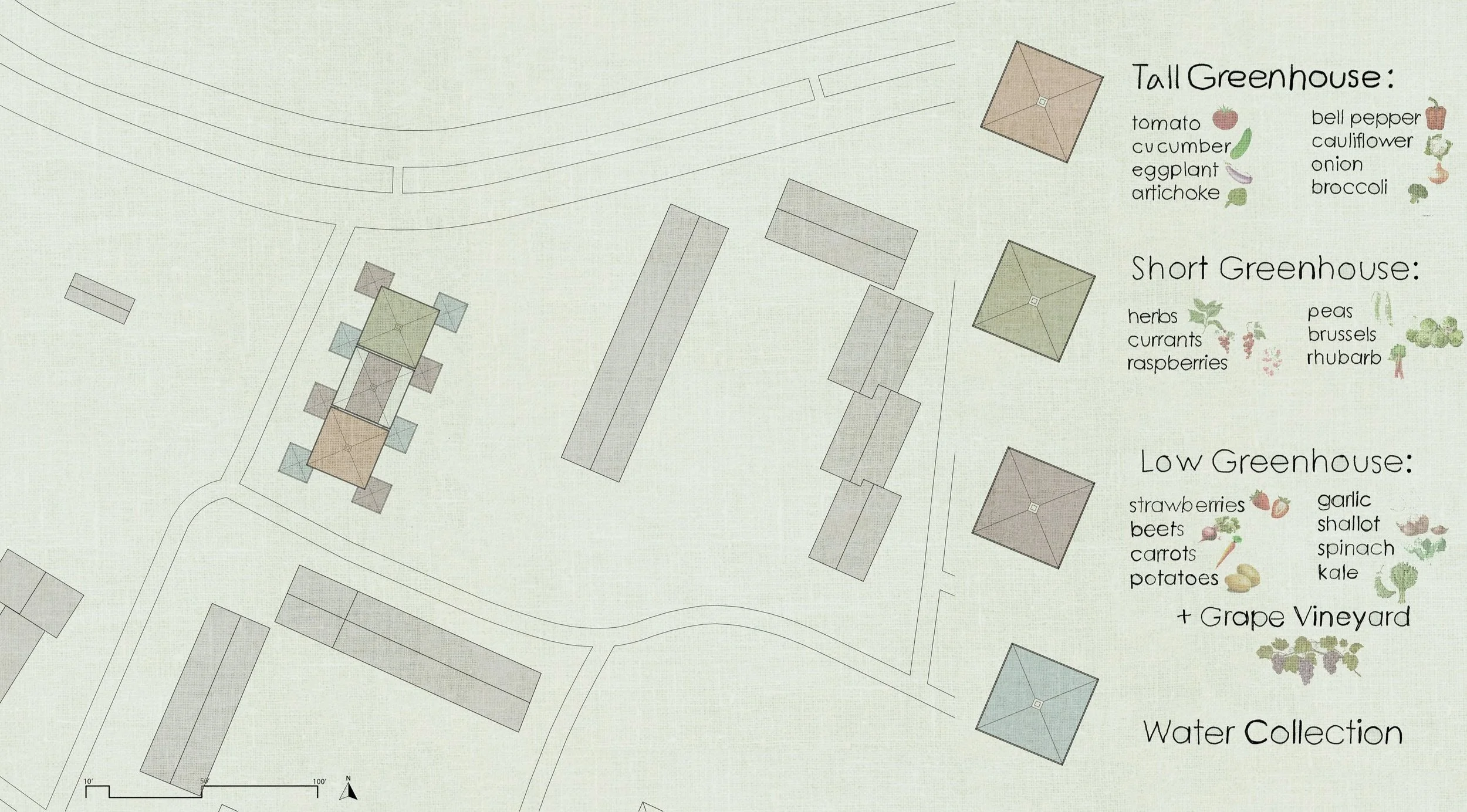 Existing umbrella-like structures on the site will be repurposed, with some removed to create open spaces, while others are retained for building upon. The greenhouse system includes tall and short structures to accommodate different plant types, along with an automated irrigation system.