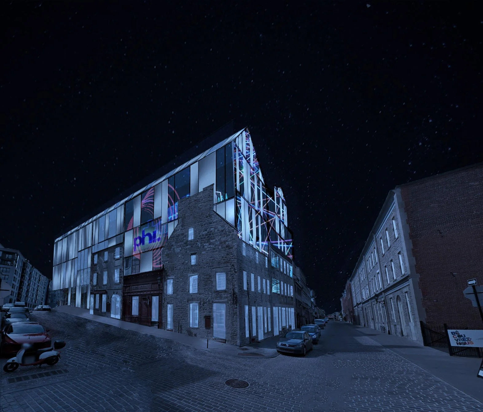 Sited in Montreal, Canada in a pre-existing building, PHI Centre is a multidisciplinary arts and culture organization that cultivates all aspects of creation, development, production, and dissemination. PHI positions itself at the intersection of art, film, music, design, and technology. Our proposed contemporary art center allows users to walk the divide between new and old while being immersed in the art and culture and engaging with the greater site of Montreal.