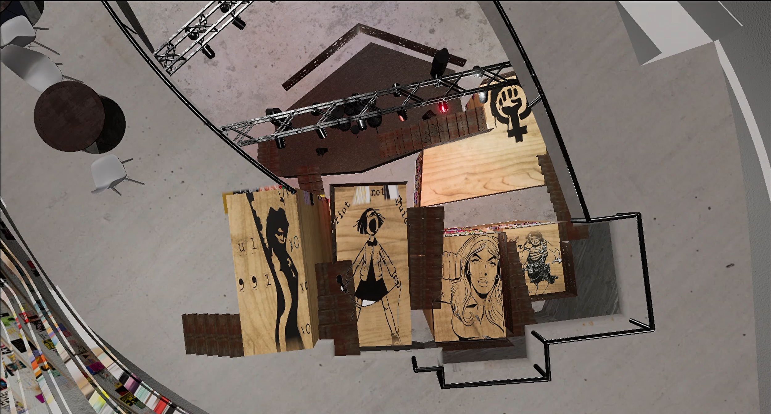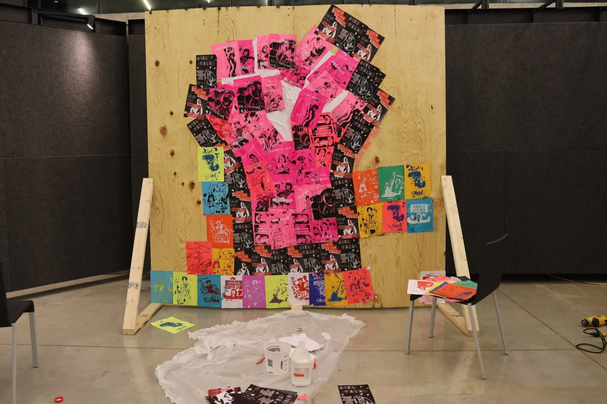 An 8x8 concert poster wall was built with individually designed concert posters inspired by the riot grrrl movement. These posters were then hand printed and painted and plastered on the plywood wall. The posters were arranged in the shape of a fist representing feminism. This is a prototype of the walls that would occupy the physical concert venue.